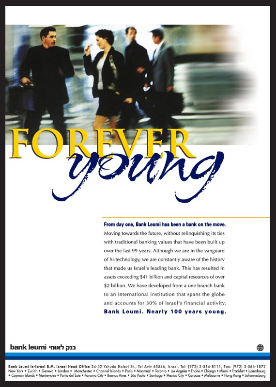 "From day one, Bank Leumi has been a bank on the move … Bank Leumi. Nearly 100 years young."